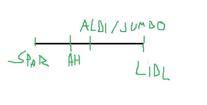 – The second biggest chain in the Netherlands, right after AH. They offer a mixture of products (In terms of quality and price) that could potentially sometimes be found in AH or Lidl. The pricing is generally close to AH, but they also offer similar discounts. Think of it as a bit cheaper (and sometimes smaller) version of appie.
